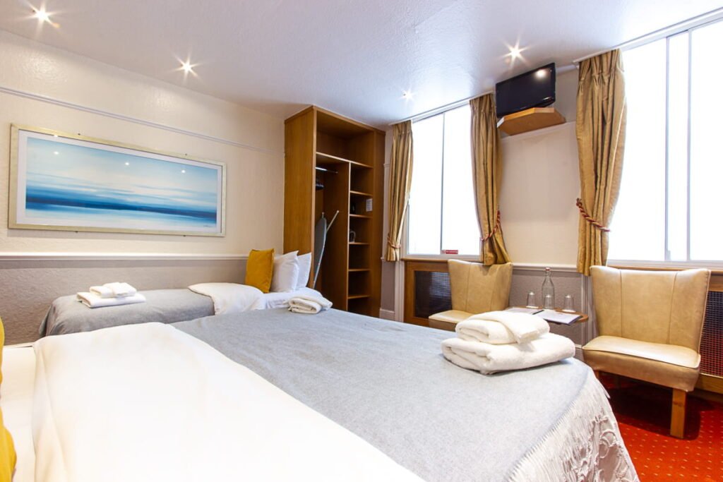 Our Triple Room, with its expansive 194 ft² layout, is ingeniously designed to accommodate various group dynamics, be it families or friends. Offering a flexible bedding arrangement of either one single and one double or three single beds, this room ensures comfort and privacy for all. Guests consistently commend the room's comfortable beds, making it a popular choice for those needing a bit more space. Complete with all the essentials for a memorable stay, our Triple Room is your home away from home in London.